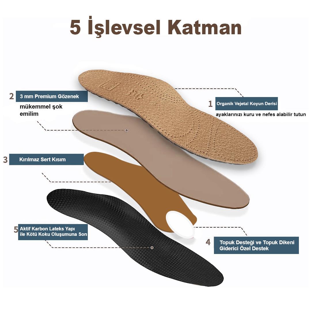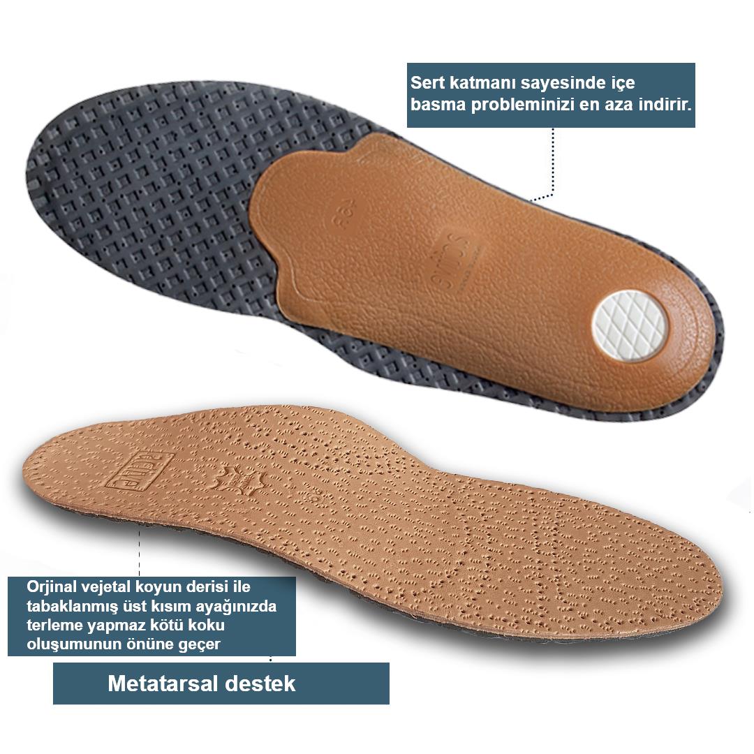 Hakiki deri tabanlık kullanımı nefes alan yapısıyla ter emici, koku oluşumunu önleyici ferah bir deneyim sağlar. Tüm ayakkabılar için uygundur. Doğal lateks kullanımı hem esneklik ve darbe emici konfor; hem de nefes alan ve doğal bir ortam oluşturur. Ark, topuk ve ön pençe destekleri ihtiyacınıza göre sizi en rahat adımlara ulaştırmak için tasarlanmıştır.