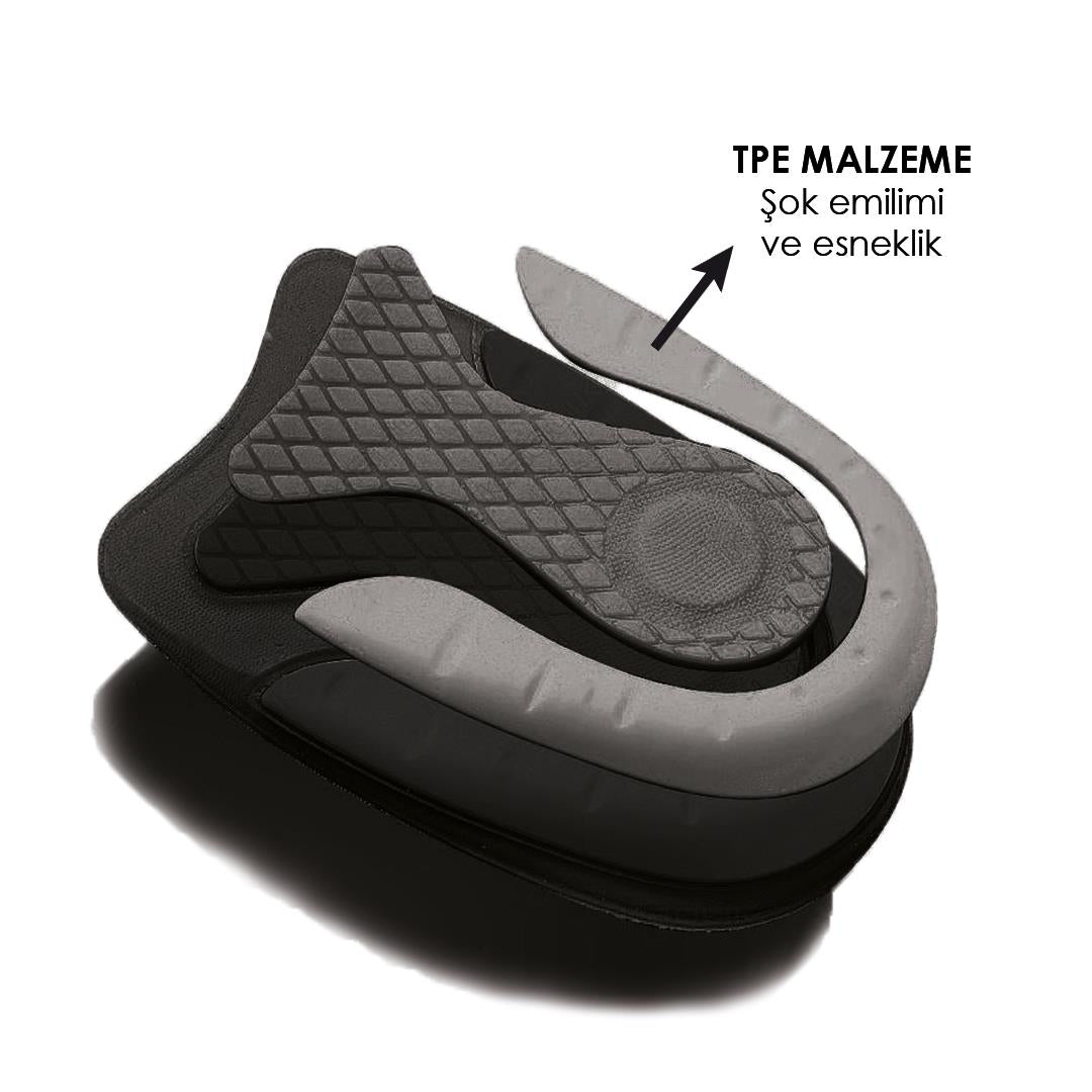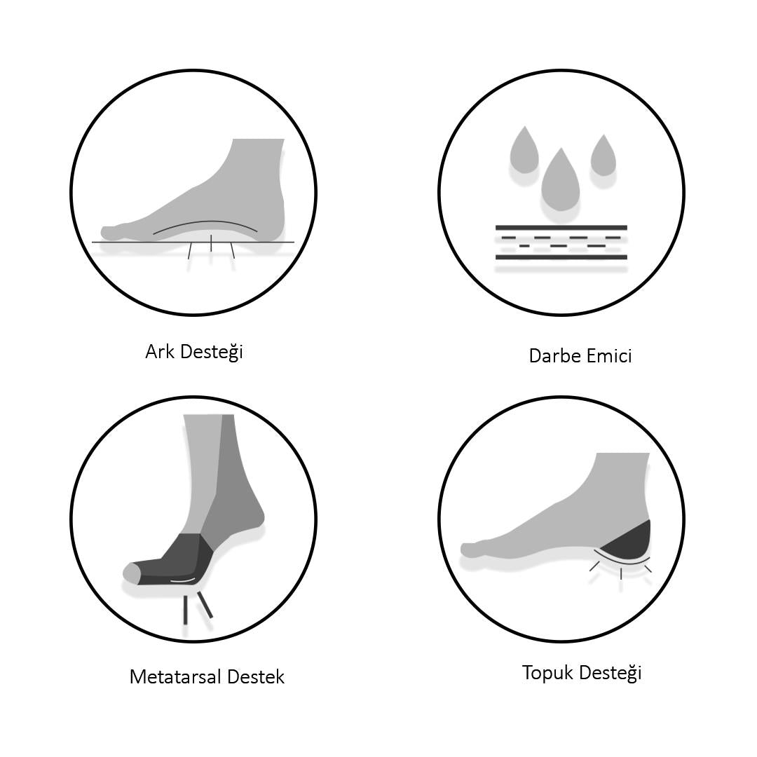 Topuk şoklarına karşı kupa formu, kaymaz ince yapısı ile denge sağlar. Topuk ağrılarını azaltır.